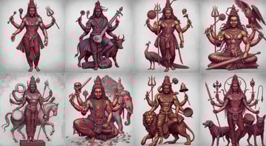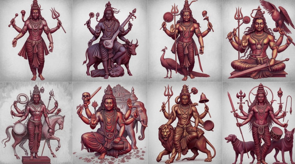 Each is depicted with his unique vahana, weaponry, and often consort—embodying the fusion of martial protection, wisdom, and nurturing presence. As modern research observes, these forms bridge cosmology, psychology, and daily life.